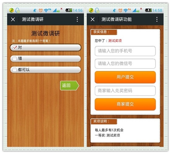 微调研功能支持自定义问卷,自定义题目,自定义选项数量,带有完善的统计功能,粉丝参加完调研后可以参加抽奖,以提高粉丝参与的积极性,商家可以添加多个调用活动