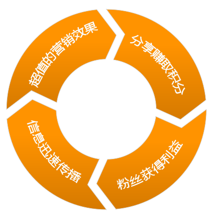 分享功能与会员卡、商城系统形成一个良性互动的圈子,粉丝与商家可以在分享中实现互利互赢,是一种营销效果极佳的信息传播方式。