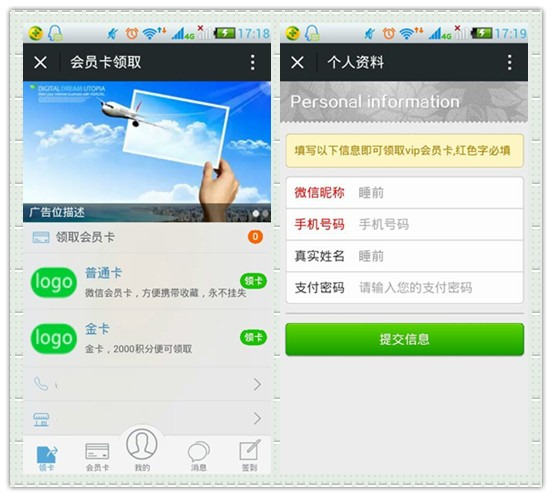 4、加入会员卡中心,集中管理领取或者发布的优惠活动,会员可以更加直观的查看已使用或者未使用的优惠活动和常用信息查看。