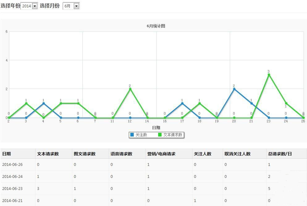 微联系统管理后台【数据魔方】【请求数详情】中实时统计微信公众账号的粉丝对各类请求(文字、图片等)数据的统计,关注数的统计,以及各类数据的趋势走向分析。